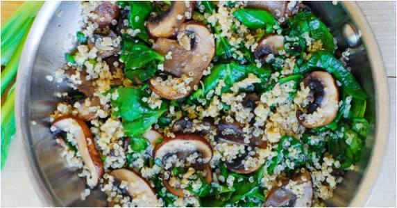 Add 2 cups of cooked quinoa to the skillet and cook on low heat for another minute until spinach wilts even more and quinoa warms up. Season with salt, if needed. Add another tablespoon of olive oil, if desired.